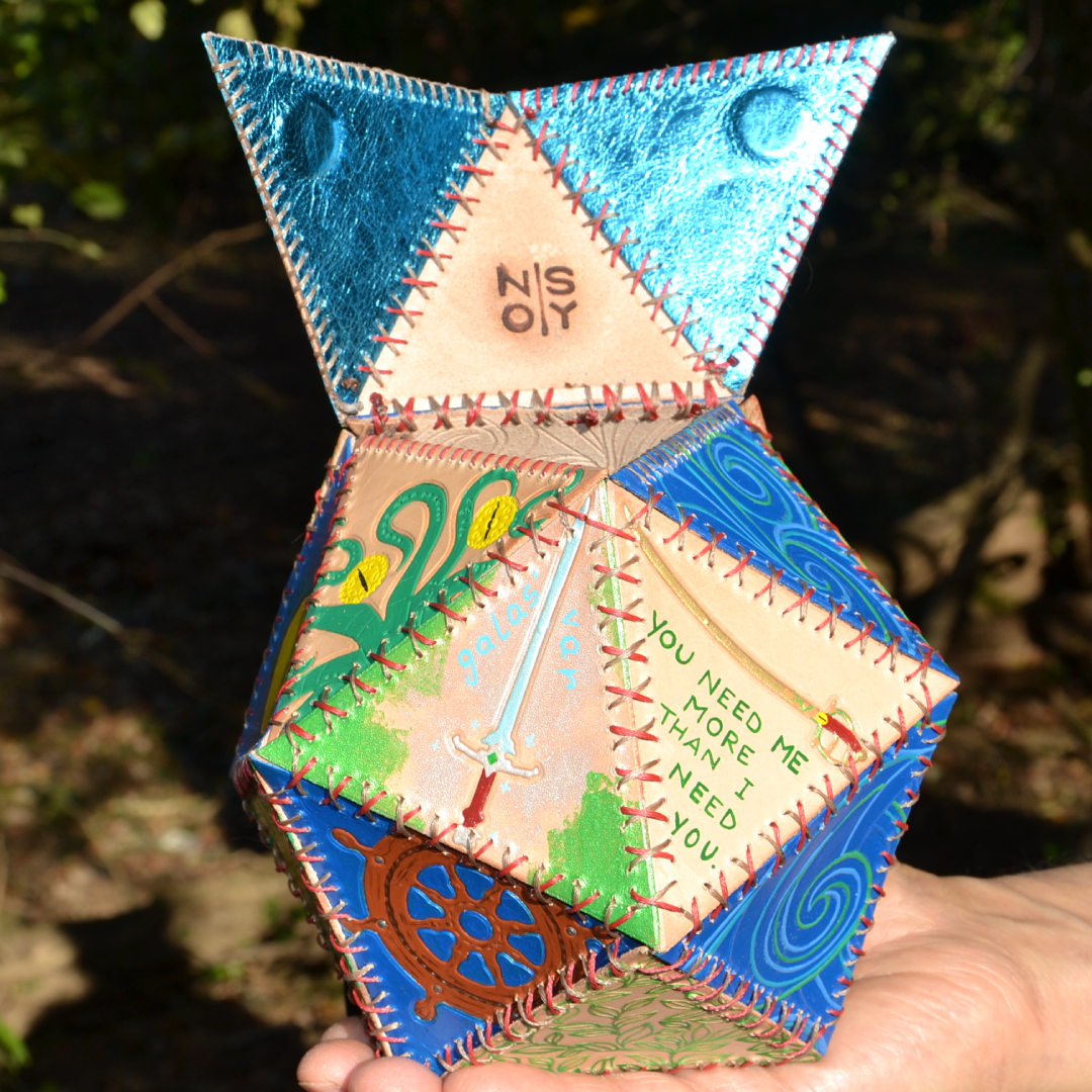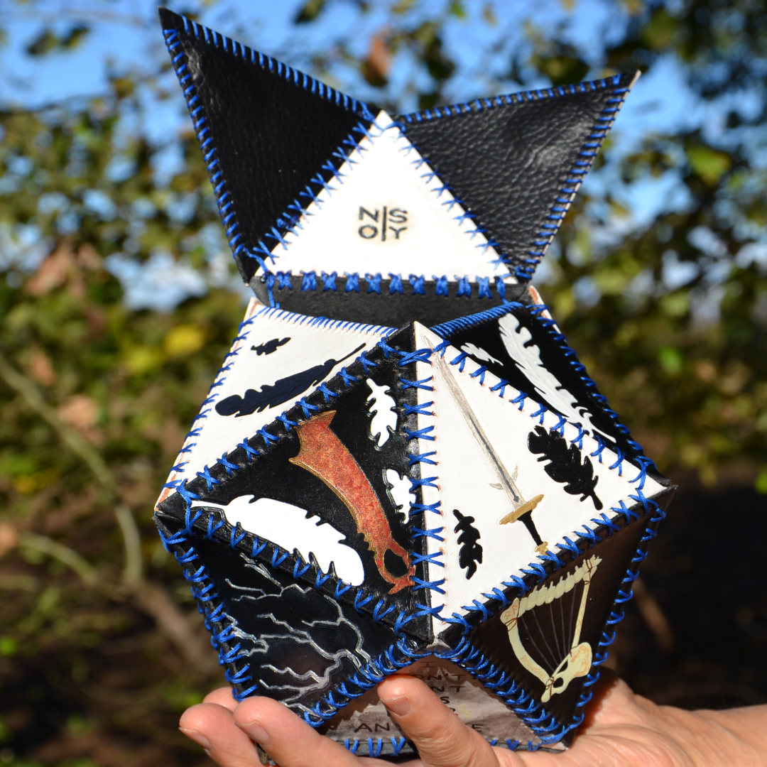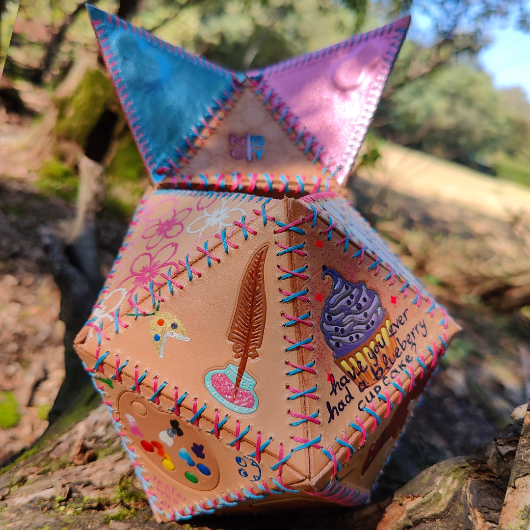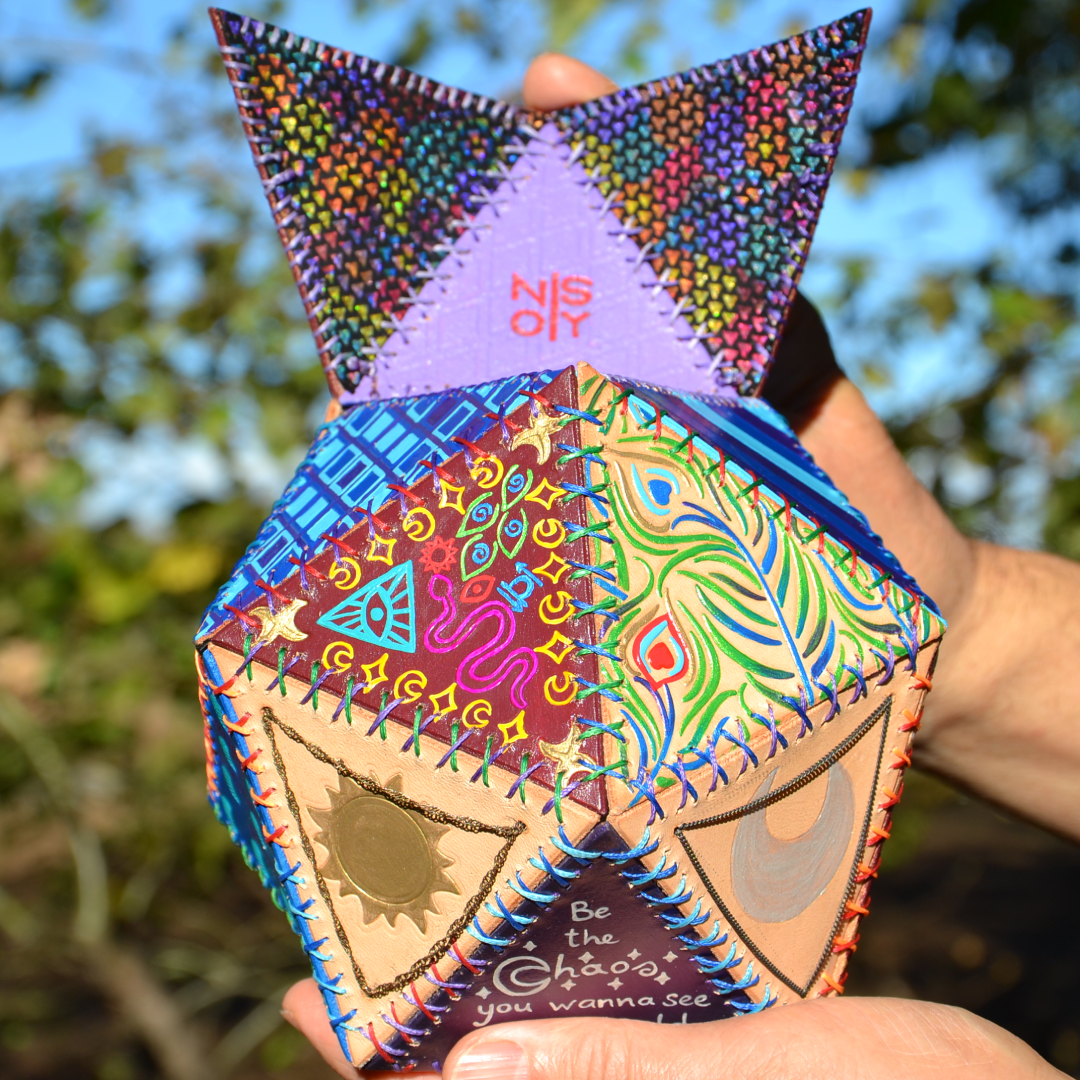 Handmade leather dicebag, inspired by precious stones, hand stitched, hand carved and painted leather. The bag has a magnetic closure.