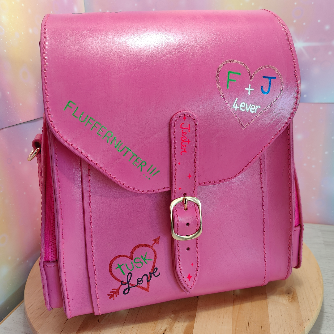 Inspired by Jester pink haversack I've made this custom leather backpack/bag 🧁🍭 The idea was to give off school backpack vibes, so it’s decorated with small drawings and phrases in that style.